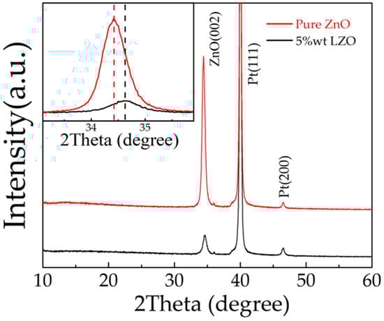 Figure 6 shows the XRD spectra of the pure ZnO and LZO thin film. The (002) peaks of ZnO, LZO, Pt (111), and Pt (200) peaks can all be observed. The (002) peak of pure ZnO is higher than that of LZO; this can be attributed to Li substituting for Zn atoms. Because of the small radius of Li atoms, the crystallinity of the ZnO thin film decreased, and reducing the peak of ZnO in 5 wt % LZO decreased. The comparison of ZnO peaks between pure ZnO and 5 wt % LZO was given in the inset. The peak of ZnO (002) of the pure ZnO sample appeared at 34.42°, and the peak of ZnO (002) of LZO shifted to the right by 0.19° to 34.61°. The substitution impurity of the small atomic radius of Li+ caused the decrease of lattice constant and produced compressive stress inside the LZO thin film, which led to the peak shift to the larger angle [38]. The ZnO thin film likely contained defects inside, such as Vo (Oxygen vacancy) and Zni (Zinc interstitial atom), which makes the ZnO films usually n-type semiconductors. After Li-doping, Li atoms as acceptor impurities increased the resistivity of the ZnO film, thereby enhancing the piezoelectric properties.