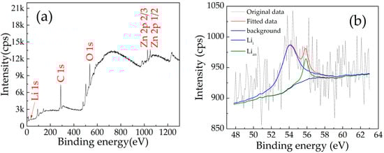 Figure 7 shows the chemical bonding states of the LZO thin film by XPS, with a scan range from 0 to 1350 eV. The binding energies were calibrated via the C 1s peak. The presence of Zn and O is confirmed in Figure 7a. The binding energy of Zn 2p3/2 and Zn 2p1/2 was found at ~1021.9 and ~1048.9. It is proved that Zn ions exist in the state of Zn2+ in the LZO thin film [39,40]. In the narrow scan of XPS spectra (Figure 7b), Li 1s spectra can be fitted into two different peaks, located at 54.1 and 55.8 eV, respectively. The peak at 54.1 eV was attributed to Li interstitial (Lii) defects corresponding to the valence state of unentire oxidation. Another Li 1s peak, located at 55.8 eV, was related to the Li-O bond, which confirms the substitution of Li+ at the Zn2+ site (LiZn) [41,42,43].