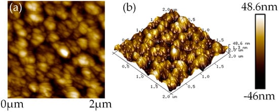 Atomic force microscopy (AFM) images of the LZO thin film: (a) Surface morphology; (b) 3D surface topography.