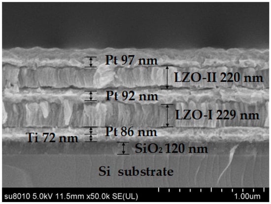 In order to study the surface morphology of the LZO thin film, samples were prepared as above and characterized by atomic force microscopy (AFM) (Innova, Bruker Corporation, Karlsruhe, Germany). Figure 8 shows the AFM images of the LZO thin film. The average grain size of the LZO film was about 113.7 nm and the roughness was 100 nm (all measured by AFM). A scanning electron microscope (SEM) was used to characterize a cross-section of the multilayered structure (SU8010, Hitachi, Tokyo, Japan). From Figure 9, it can be seen that the LZO film grew along the c-axis direction and showed a columnar structure. The particle size of the two LZO thin films coincided with the results obtained by AFM. The thicknesses of the TE, LZO II, ME, LZO I, BE, Ti layer, and SiO2 layer, approximately measured by SEM, are shown in Figure 9.