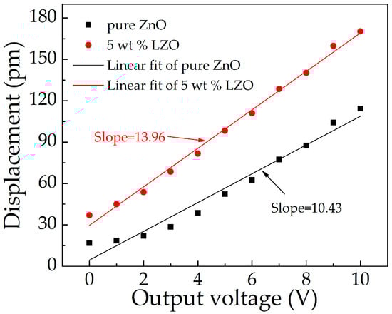 In order to study the piezoelectric properties of pure ZnO and LZO thin films, piezoelectric force microscopy (PFM, Bruker Multimode 8, Billerica, MA, USA) was used to measure the piezoelectric constant d33 of pure ZnO and LZO thin films. The deformation of the thin films was measured by applying voltage at both ends. As shown in Figure 10, with the increase of applied voltage in the range of 0 to 10 V, the displacement of ZnO thin films increased in the range from 16.8 pm to 114.3 pm, and that of LZO films increased in the range from 36.9 pm to 170.3 pm. The two curves were fitted linearly, and the slope of the fitted line was piezoelectric coefficient d33. We could see that the d33 of LZO thin films was 13.96 pm/V, which is higher than that of ZnO 10.43 pm/V, and the enhancement percentage is 33.84%. This proves that the piezoelectric properties of ZnO films can be improved by introducing Li as an impurity.