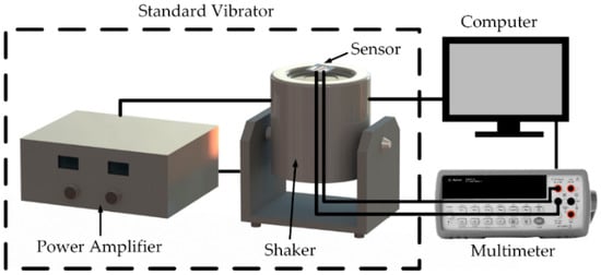 The testing system of the proposed acceleration sensor consisted of a standard vibrator (Dongling ESS-050, Dongling Vibration Test Instrument Co., Ltd, Suzhou, China), multimeter (Agilent 34401A, Agilent Technologies Inc., Santa Clara, CA, USA), and computer. The system can be tested for vibration and sensitivity characteristics with an exciting frequency from 50 to 20,000 Hz and acceleration from 0 to 30 g, and the test data can be automatically acquired, as shown in Figure 11.
