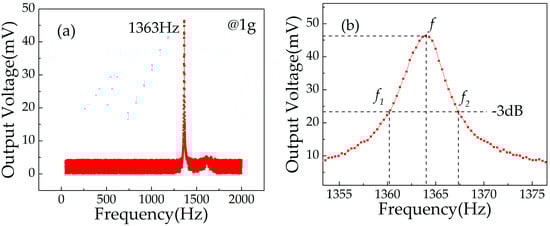 The response frequency characteristics of the sensor were tested by the frequency sweep mode of the standard vibrator. The sweep range of excitation frequency was from 50 to 2000 Hz under a 1 g acceleration. The acceleration sensor was rigidly fixed on the vibrator, the BE and TE of the sensor were connected to the multimeter, acceleration acted on the sensor along the z-axis, and the output voltage (Vout2) of the sensor was collected in real time. In a certain excitation frequency range, the relationship between excitation frequency and Vout2 was studied. When the applied frequency reached a certain value, the resonance effect occurred in the cantilever beam structure, and accordingly, the output voltage could reach the maximum value. Figure 12a shows the relationship curve between output voltage and excitation frequency under an acceleration of 1 g. When the excitation frequency reached 1363 Hz, Vout2 reached the maximum value of 46.3 mV, and only one obvious peak was observed, which meant that only the first mode existed in the scanning frequency range. The results show that the resonance frequency of the fabricated cantilever beam structure was 1363 Hz. This is close to the simulation results of 1327.7 Hz, but there are deviations. The main reasons are as follows: (1) In the fabrication process of the cantilever beam, the uniformity of ICP etching had errors, which resulted in the uneven thickness of the cantilever beam and changed the resonance frequency; (2) although the total thickness of the multi-layer structure on the cantilever beam was much thinner than the thickness of the cantilever beam, it still affected the resonance frequency of the cantilever beam.