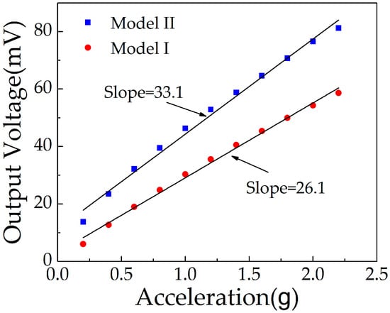 The output voltage characteristics of the double and single piezoelectric layers were measured by applying 0.2–2.2 g acceleration (0.2 g increment) along the z-axis direction of the sensor at resonance frequency (1363 Hz). As shown in Figure 13, with the increase of applied acceleration, Vout1 increased from 6.05 mV to 58.59 mV, and Vout2 increased from 13.8 mV to 81.2 mV. The slopes of fitting lines represent the sensitivity of the sensor. Sd and Ss were 33.08 mV/g and 26.05 mV/g, respectively. The sensitivity of the double LZO thin film structure was higher than that of the single LZO thin film structure, but it was not twice as large as the single LZO thin film. This is because the thickness of the LZO I film was not equal to that of the LZO II in the process of thin film preparation, so it was not consistent with the conclusion of Equation (11) in the ideal state.