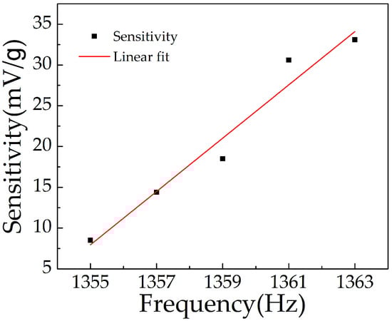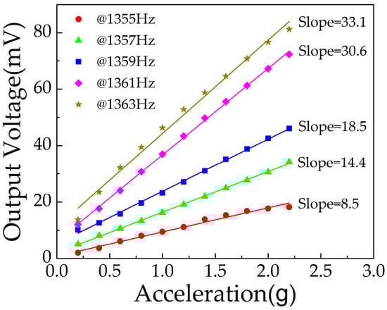 The output voltage of the sensor below the resonance frequency, in the range from 0.2 g to 2.2 g, is given in Figure 14. The sensitivity was reduced with decreased excitation frequency. Under the applied frequency of 1361 Hz, 1359 Hz, 1357 Hz, and 1355 Hz, the sensitivity was 30.6 mV/g, 18.5 mV/g, 14.4 mV/g, and 8.5 mV/g, respectively. With the decrease of excitation frequency, the resonance effect of the cantilever beam was weakened, resulting in reduced deformation. From Figure 15, we can see that the sensitivity was approximately linear with the excitation frequency, in the range from 1351 Hz to 1363 Hz.