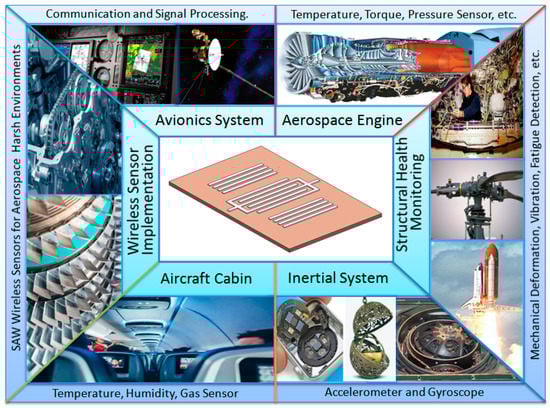 In comparison with other potentially competitive technologies, SAW technology has special advantages for aerospace applications, as shown in Figure 1. SAW devices can be small, rugged, passive, wireless, and radiation hard and operate with variable frequency and bandwidth [8], which can well meet the aerospace requirements for small, lightweight, inexpensive, and wireless sensors. For example, structural health monitoring (SHM) of aerospace vehicles are greatly important for the safety of the crew and the vehicle. However, some battery-powered sensors are constrained to use in the harsh environment (e.g., extreme temperature and pressure) and the narrow internal space with limited access. One solution to these constraints is to use wireless instead of wired sensors for SHM applications. In contrast to current wireless systems, the small, passive wireless SAW sensors can operate without batteries across a large temperature range to sense physical and chemical parameters [9,10]. Furthermore, multiple sensing parameters also can be obtained using distributed SAW sensor arrays to encode the sensor information and transmission to the receiver [8].