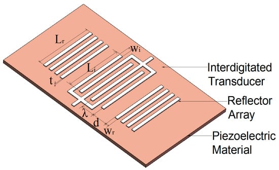 Figure 2 shows the schematic three-dimensional (3-D) structure of the designed single-port SAW resonator, which consists of a piezoelectric substrate (128° Y-X LiNbO3), an Au IDT electrode fabricated on the piezoelectric substrate, and a pair of grating reflectors located on both sides of the IDT [23]. The excited resonant wavelength λ of SAW resonator is determined by IDT period spacing Pi and acoustic velocity ν. The resonant frequency f of the SAW resonator can be expressed as: