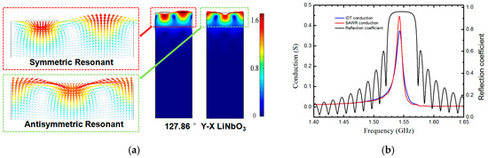 By the numerical calculation based on COM theory, the parameters of the IDT and the grating reflectors were optimized (e.g., the length of IDT aperture Li, the pairs of IDT/reflector Ni and Nr, metallization of IDT/reflector η, Au thickness t) to realize a 1.5 GHz SAW. Table 1 present the optimal design parameters of SAW resonator based on 128° Y-X LiNbO3 substrate. The bar-width and pitch-width of the IDT and the grating reflector were determined to be 600 nm, corresponding to a 2.4 μm of period of IDTs. There are 148.5 pairs of input and output IDT and 100 pairs of grating reflectors on each side, corresponding to a length of IDT aperture of 60λ. A 60 nm thick Au was designed to fabricate IDT and reflectors. The distance between IDT and reflector was adjusted to 2.4 μm so that the peak of IDT conductance lies in the center of stop-band of reflectors. As a result, a maximum conductance of SAW and thus the optimal energy efficiency were obtained in the resonant structure. The simulated results are shown in Figure 4. It can be seen that the optimal conductance peak of SAW resonator is well located at the stop-band of reflecting gate, and a resonant frequency of 1.52 GHz is determined to match a 2.4 μm of period of IDTs and an acoustic wave speed of around 3700 m/s. Table 2 presents the COM parameters used for the simulation and optimization of the resonator, which were extracted from the FEM analysis [25,26,28,29].