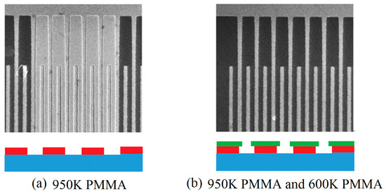 Generally, the thickness of the resist should be more than two times of that of deposited metal film in order to perform the next lift-off process. If the metal film is deposited by the magnetron sputtering technology, the thickness could be larger because of step coverage; otherwise, the lift-off will be difficult. When the thickness of deposited metal film is greater than 50nm, the exfoliation can be improved by using double-layers resist to obtain the inverted T-shape structure after exposure and development. The relative molecular weight of PMMA electron beam resists has a significant effect on the sensitivity and resolution of exposure. e.g., 600 K PMMA has high sensitivity but low resolution while 950 K PMMA has the reverse properties when compared to 600 K PMMA. Therefore, the cracking size of 600 K PMMA will be larger than that of 950 K PMMA when an electron beam spot is incident on the surface of resist. As a result, the double-layers resist (upper/lower layer = 950 K/600 K PMMA, 950 K is 120 nm and 600 K is 240 nm.) structure will form an inverted T-shape structure after development, which is beneficial to metal lift-off process. Figure 5 shows a comparison of experimental results of metal IDT fabrication using single-layer and double-layers resist. It can be seen that the use of double-layers resist can make a more complete IDT structure than use of single-layer resist.
