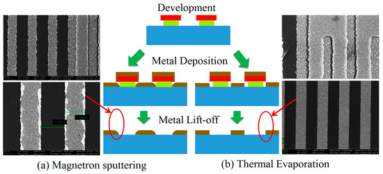 A comparison of the experimental results and of metal IDT fabrication using magnetron sputtering (a) and thermal evaporation (b).