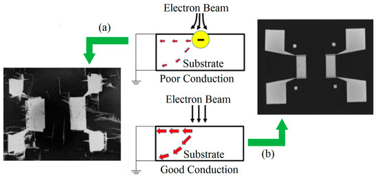 When an electron beam resist coated substrate is irradiated by a high beam-current density of electron beam, the charges will accumulates on the surface if the resist or substrate is of insulating material. The accumulated charges will give rise to the deflection of E-beam caused by the electric field produced by the trapped charges, resulting in a considerable amount of pattern displacement and distortion. Generally, piezoelectric materials (e.g., LiNbO3, quartz, AlN) are good dielectric materials with poor conductivity. The effect of charge accumulation on exposure accuracy can be reduced by using low accelerated voltage. However, the low accelerated voltage will lead to a large proximity effect, making the exposure precision worse. For a shallow structure, an optimal accelerated voltage (e.g., 10 kV in this work) can be used to achieve a good balance between charge accumulation and proximity effect. For a deep structure, the feasible approach reducing charge accumulation is to deposit a very thin layer of high conductive layer (e.g., Au, Al, Cr) on the surface of the resist in order to dissipate the charge during EBL exposures. It is important to note that a thick metal layer will scatter electrons and limits the fabrication at deep structure. The experiments demonstrate that a 10 nm thick Au layer deposited by sputtering can alleviate the charge accumulation effect obviously without affecting the resolution of the final exposure pattern. Figure 7 shows a comparison of patterns of e-beam exposure on LiNbO3 substrate with and without Au layer on resist. A schematic illustration also shows the effect of with and without Au layer on dissipating the charge during EBL exposures.