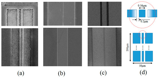 The modulation exposure is a good strategy, by which the exposure does can be adjusted and controlled according to the proximity correction algorithms for achieving uniform resist exposure. Figure 8 shows the influences of under-exposure, over-exposure, and modulation exposure on proximity effect. It can be seen from Figure 8a that the under-exposure due to low exposure will result in a large amount of residual resist that appear in the whole developed pattern. In contrast, if the exposure dose is suitable for the middle area, a proximity effect will result in an over-exposure in adjacent area where if a same exposure dose is still used, as shown in shown Figure 8b. In order to avoid above situation, the exposure dose used in the adjacent area can be adjusted in gradient change to correction the proximity effect. Figure 8c exhibits a perfect developed pattern when using a modulation exposure based on a specially designed modulation exposure graphics with the color intensity to display exposure does, as shown in Figure 8d.