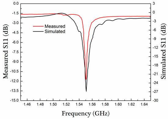 Figure 9 shows a frequency responses comparison of the simulated and measured S11 of SAW resonator based on 128° Y-X LiNbO3. For the measured S11, the SAW resonator exhibits a Rayleigh wave resonance peaks at 1.550 GHz with return loss about −11.92 dB, and quality factor Q is 517 [30]. In contrast, for the simulated S11, the resonance peak is 1.532 GHz with return loss about −35.59 dB, and quality factor Q is 775. It can be seen that the frequency difference of both resonance peaks is about 5 MHz. At same time, there is a significant difference in return loss and Q, which is attributed in the impedance mismatching. The response spectrum of S11 was repeatedly measured several times in quite long period of time, and it was found that the resonant frequency remained fairly stable, which indicates that the SAW resonator can meet the needs of sensing applications.