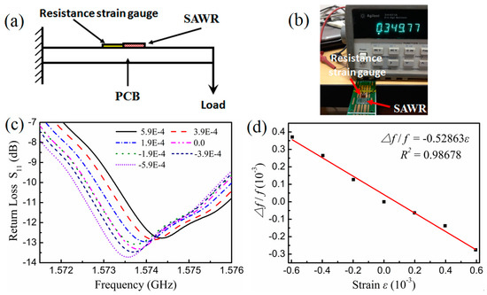 Figure 11a shows a schematic diagram of strain measurement method of the SAW strain sensor. The strain sensing test of LiNbO3-based SAW resonator was performed in a PCB cantilever with a piezo-resistive strain gauge to calibrate the strain. As shown in Figure 11b, a SAW resonator and a 35 Ω piezo-resistive strain gauge with the sensitivity K of 2.0 and the strain limit of 2% were glued on the middle position of PCB cantilever. The strain ε can be calculated by the change in resistance of strain gauge, ΔR = Kε. Figure 11c shows the S11 response of SAW strain sensor under different strains. Experimentally, it was found that the positive strain (tensile stress) will down-shift the resonant frequency of SAW resonator while the negative strain (compressive stress) will up-shift the resonant frequency. Figure 11d exhibits a negative linear dependence of the frequency-shift change ratio Δf/f on strain ε, with a strain coefficient of frequency-shift change ratio of −0.53 ppm/με and strain sensitivity of −831 Hz/με. This sensitivity can be further improved by using thinner LiNbO3 substrate and more sensitive package structure.