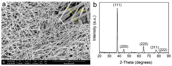 (a) SEM images of silver nanowires after being purified and (b) XRD spectrum of the synthesized silver nanowires.
