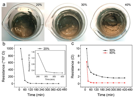 (a) Photos of the ECAs filled silver nanowires with 20, 30, and 40 wt% loadings. (b,c) The variations in resistance of ECAs filled silver nanowires with different loadings during curing at room temperature for 7 h: (b) 20 wt%, (c) 30 and 40 wt%. The inset in Figure 3b shows the locally magnified curve.