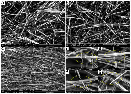 To verify whether the complete curing had been carried out at room temperature and the compatibility of the room temperature cured ECAs with a subsequent low- or high-temperature bonding process, the cured ECAs filled with 30 wt% silver nanowires continued to be cured at 180 °C and 250 °C for 20 min in a vacuum oven, respectively. The resistance was measured to be 1.1 Ω after 180 °C heat curing, showing little change. The SEM images in Figure 4a,b show the conductive networks before and after the ECAs being cured at 180 °C. There was nearly no difference in the distribution and the morphology of silver nanowires, which further demonstrated that effective conductive networks had been established at room temperature. Based on previous reports [38,39,40], we deduced that it was PMMA which contributed to the cold curing of the as-prepared ECAs and that the silver nanowires accelerated the curing process. Nevertheless, the resistance increased obviously from 1.7 to 20 Ω after 250 °C heat curing. As represented in Figure 4c–g, large amounts of sintering and fracture are observed in the silver nanowires, which leads to localized disruption of the three-dimensional conductive network and an irreversible increase in resistance of the ECAs. As such, we speculated that the room-temperature cured ECAs cannot provide a robust contact with low resistance during the high temperature bonding process (> 200 °C). However, the applications of the ECAs in TSV technology will not be limited due to the low-temperature (< 200 °C) bonding technology innovations that can overcome issues related to the high temperature bonding process, for instance, cracks of thinned and fragile wafer during bonding, performance degradation under higher bonding temperature, serious wafer/chip warpage, bonding misalignment, and compatibility with the back-end-of-line process conditions and materials [41,42,43].