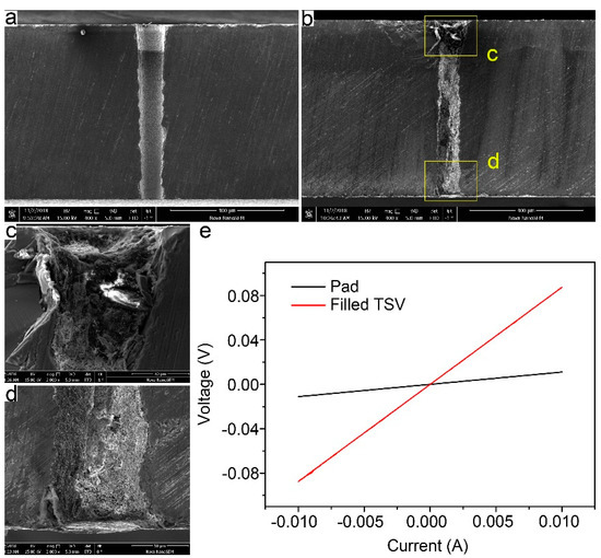 Figure 5e shows the I-V curves of a fully filled TSV (red) and deposited Ti/Au pad (black), which were obtained by a sourcemeter attached to a manual analytical probe station equipped with a four-point probe. According to the I-V curves, the resistance of a fully filled TSV was calculated to be 7.5 Ω (the resistance of Ti/Au pad had been deducted). That was about twice the theoretical value, which was calculated to be 3.7 Ω by the Equation (2):