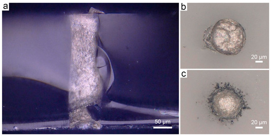 To demonstrate the universality of the room temperature treatable, low-cost, and high through-put TSV process mentioned above, this process was applied to the vias of other materials, e.g., the through glass vias (TGVs), another attractive technique in MEMS and other 3-D packaging fields [44,45]. Figure 6 represents the profile of a TGV filled with the 30 wt% silver nanowires ECAs and cured for 3 h at room temperature. The via with a depth of about 300 μm and an inlet diameter of about 100 μm was fully filled, as depicted in Figure 6a. In addition, the top and bottom of a filled-via were flat and leveled with the substrate surface, as shown in Figure 6b,c. Then the I-V curve of a fully filled TGV was obtained by using the same test method as that of TSVs, as shown in Figure S2. According to the I-V curves, the resistance of a fully filled TGV was calculated to be 4.3 Ω (the resistance of Ti/Au pad had been deducted), showing a similar resistivity to that of a fully filled TSV. As such, the simple, cost-effective, high through-put and robust filling method of through unknown vias (TXVs) with room temperature curing ECAs shows great potential and universal in via metallization for MEMS and other packaging applications.