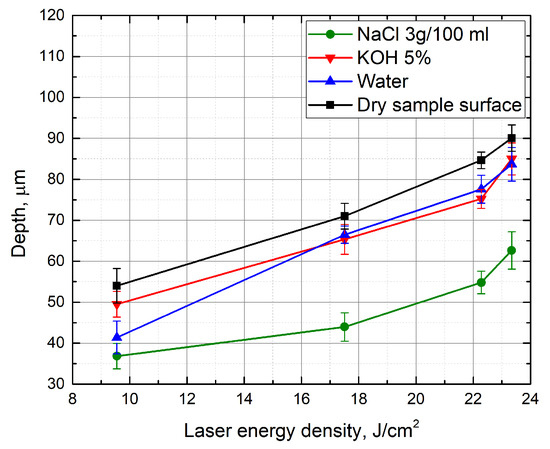 Depth of the grooves formed in the glass sample in dependence on the laser energy density. Grooves were formed while the glass sample surface was dry and immersed in different environments—5% KOH, 3 g/100 mL NaCl solutions, water. Scanning speed—100 mm/s, number of scans—15, pulse repetition rate—60 kHz.