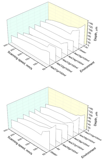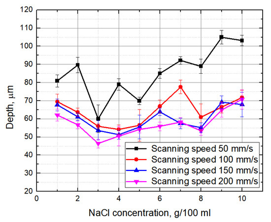 Firstly, the dependence of the groove depth on laser energy density was evaluated (Figure 2). Measurements were made when the laser beam scanning speed (100 mm/s) and the number of scans (15 scans) were kept constant. It can be seen that, independently of the environment in which the glass plate is processed, the depth of the formed grooves is nearly linearly dependent on laser energy density. Figure 3 and Figure 4 show the dependence of the formed grooves depths on the scanning speed when the sample is processed in different media—in NaCl aqueous solution, water and on a dry surface of the glass. All measurements were performed at a fixed number of scans (15), average laser power (5 W), and pulse repetition rate (60 kHz). The concentration of NaCl aqueous solution was changed from 1 g/100 mL to 10 g/100 mL. It can be seen that, in all cases, with increasing scanning speed, the depth of grooves decreases. At a low scanning speed, the number of pulses per unit area is higher. For this reason, the ablation process takes longer, resulting in more effective ablation. It is also noticed that deeper grooves are formed when there is no additional water or NaCl aqueous solution layer above the specimen. However, increasing the concentration of the NaCl aqueous solution reveals a tendency towards increasing the depth of the grooves, which is particularly evident at a low scanning speed (50 mm/s) (Figure 5). This dependence is probably due to the fact that chlorine acts as a catalyst for the chemical reactions using NaCl solutions in laser microprocessing [19].