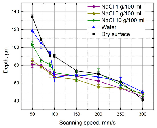 Depth of the grooves formed in the glass sample in dependence on the scanning speed. Grooves were formed while the glass sample surface was dry and immersed in different concentrations (from 1 g /100 mL—to—10 g/100 mL) of NaCl aqueous solutions, and water. Number of scans—15, average power—5 W, pulse repetition rate—60 kHz.