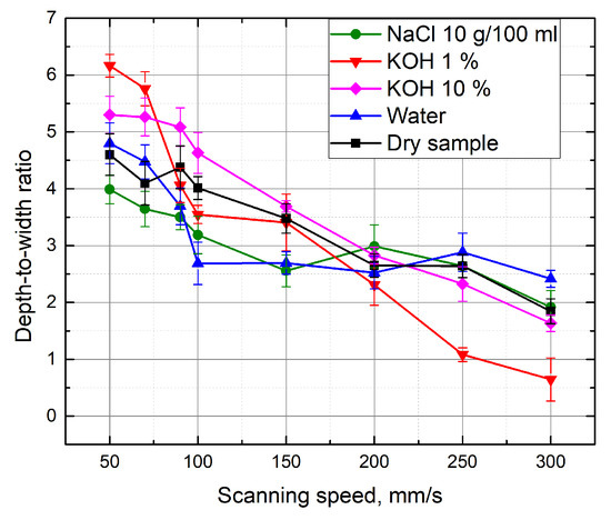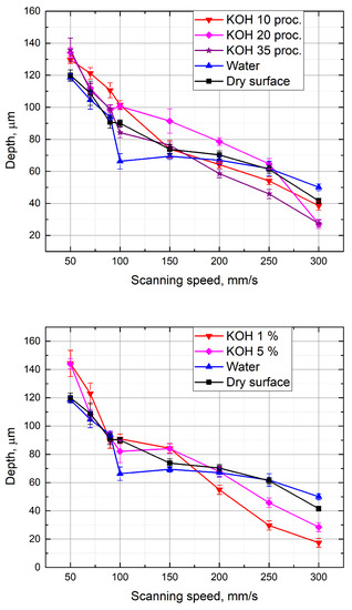 Figure 9 shows the width of the formed grooves in dependence to the scanning speed. By performing the micro-machining in different media, the width of the formed groove varied from 20 m to 28 m. In order to determine the machining efficiency, the depth-to-width ratio of the grooves was evaluated. Figure 10 shows the depth-to-width ratio of the grooves formed in different media depending on the scanning speed. It can be seen that the highest values of this parameter are available at a low scanning speed (50 mm/s). Dependence is valid for processing in various media. In this case, the maximum groove depth and width ratio is obtained when the grooves are formed with an additional 1% KOH solution layer above the sample.