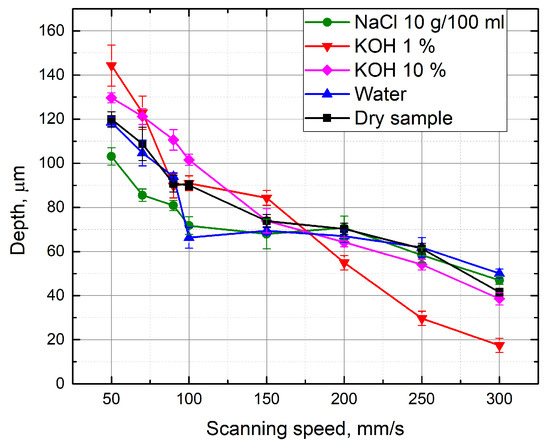 Depth of the grooves formed in the glass sample in dependence on the scanning speed. Grooves were formed while the glass sample surface was dry and immersed in different concentrations (1%, 10% KOH, 10 g/100 mL NaCl) aqueous solutions, water. Number of scans—15, average power—5 W, pulse repetition rate—60 kHz.