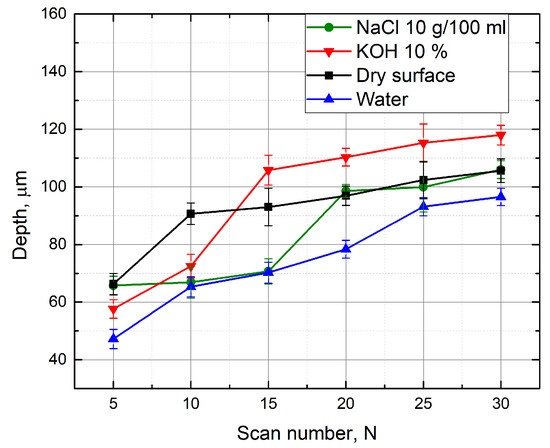 Depth of the grooves formed in the glass sample in dependence on the scan number. Grooves were formed while the sample surface was dry and immersed in different liquids—10% KOH, 10 g/100 mL NaCl aqueous solutions, and water. Scanning speed—100 mm/s, number of scans—15, average power—5 W, pulse repetition rate—60 kHz.