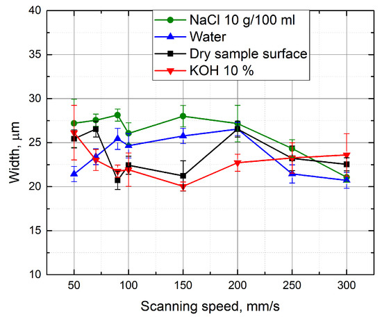 Width of the grooves formed in the glass sample in dependence on the scanning speed. Grooves were formed while the glass sample surface was dry and immersed in different liquids—10% KOH, 10 g/100 mL NaCl solutions, and water. Number of scans—15, average power—5 W, pulse repetition rate—60 kHz.