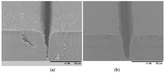 Most of the investigations of the microfabrication process under KOH and NaCl aqueous solutions were performed on metals, silicon carbide, silicon and ceramic materials [24,25,26]. In some of the studies, it was shown that the application of a chemically active KOH solution during silicon microfabrication does not necessarily help to increase the etching rate and even it can stop the etching of Si surface [27]. During liquid assisted femtosecond laser machining of quartz plates in KOH solution, etching enhancement along E-field of a linearly polarized laser beam was observed [28]. To our knowledge, no studies were performed on femtosecond laser micromachining of soda–lime glass under KOH or NaCl aqueous solutions. Other interesting results were presented on the microfabrication in organic solutions, e.g., methanol, acetone, ethanol and toluene [29,30]. Alcohol-assisted femtosecond photoetching of silicon carbide was shown to be beneficial to decreasing the redeposition of debris and increasing the ablation depth [31]. In order to compare our results in aqueous solutions with femtosecond laser micromachining of soda–lime glass in organic solutions, additional experiments must be done.