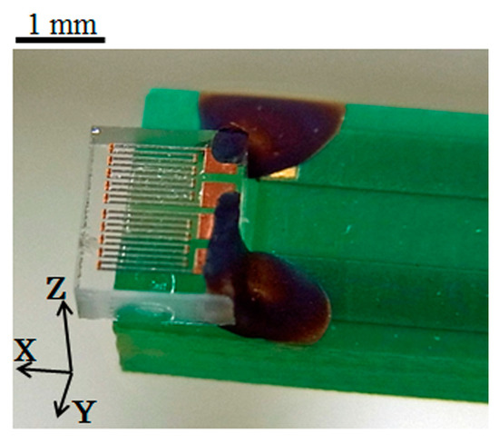Figure 1 shows the view of sensor element. The element was fabricated by a thin-film process. An amorphous Co85Nb12Zr3 film was RF-sputter deposited onto a soda glass substrate and then micro-fabricated into rectangular elements by a lift-off process. The element was 1000 μm length, 50 μm wide, 2.1 μm thick. The tens of elements are aligned in a parallel configuration and connected by Cu thin-film strips to form a meander pattern. A magnetic field was applied while the RF-sputter deposition for the purpose of inducing uniaxial magnetic anisotropy. The direction of the magnetic anisotropy in this study was in the width direction, Y, so to say short side direction of the element strip. It is induced by the direction of the magnetic field while sputtering. The sensor element was mounted on printed circuit board (PCB) and electrically connected by a conductive silver paste.