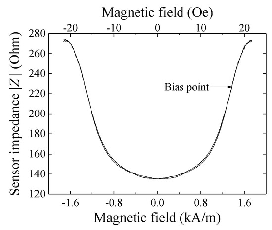A typical example of variation of impedance of the sensor itself without a PCB as a function of external field is shown in Figure 2. In this figure, the external field was applied in the in-plane length direction of the sensor strip, X-direction, which is the sensing direction. This impedance variation was obtained by S11 measurement of a network-analyzer using high-frequency probe for electric connection with the electrode pads of sensor element. The result shows a parabolic variation, which is typical for a magneto-impedance sensor having magnetic anisotropy in the width direction. The minimum impedance, |Z|=138 Ω at 0 kA/m (0 Oe), and the maximum was 275 Ω around ±1.76 kA/m (±22 Oe). In this figure, a bias point is shown, on which this sensor was operated.