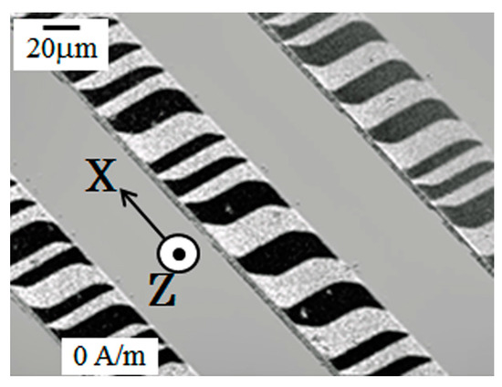 Figure 3 shows the magnetic domain of the sensor element observed by Kerr microscope (BH-762PI-MAE, NEOARK Corporation, Tokyo, Japan). The magnetic domain forms contiguous regions of magnetic momentum with anti-parallel direction. This picture shows a magnetic domain when an external magnetic field was zero. As increasing or decreasing the external field applied along the length direction, X, which is the sensing direction of sensor, the width of the contiguous domain regions changes and finally the domain would be a single domain with a momentum directing the same as the external field direction. In this element, the magnetic momentum in each region vibrates by the effect of the high-frequency current running through the element, and the impedance of the element changes as the magnetic domain changes. In another word, the magneto-impedance effect comes from the change of the condition of the momentum vibration caused by the change of both the direction and the distribution of the momentum in the thin-film element having an in-plane uniaxial magnetic anisotropy.