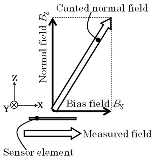 Figure 4 shows a schematic of magnetic field when the sensor is operated. The sensor needs a biasing field for operation in the X direction, it is about 1.4 kA/m (17.5 Oe) as shown in Figure 2. The sensing magnetic field is also in X direction. Therefore, a constant bias field is essential for this sensor system.