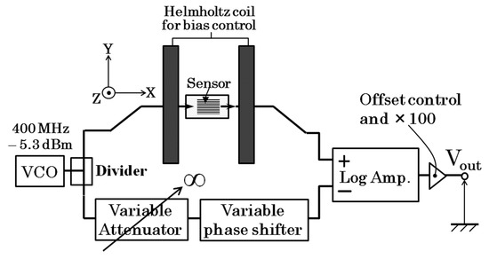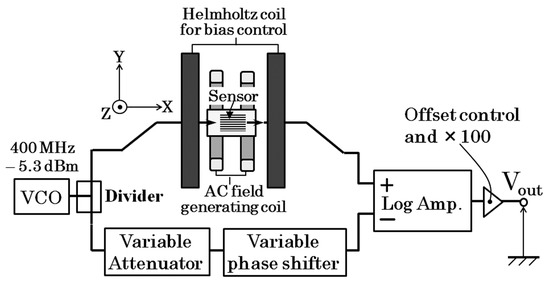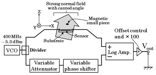 Figure 5 shows the proposed driving circuit of the thin-film sensor. A 400 MHz alternating signal at −5.3 dBm was generated by a voltage-controlled oscillator. The signal was divided into two and one was introduced to the sensor element and the other was introduced to a series of RF control devices. As shown in the figure the latter is a series of variable attenuator and a variable phase shifter. Both of them were electrically voltage-controlled ones. The RF signal going through the latter way of circuit branch was controlled in the same phase and amplitude as the one going through the sensor when an external magnetic field is a certain reference value. Each signal was inputted to a logarithmic amplifier as a pair of differential inputs. The logarithmic amplifier detects 400 MHz signal into a voltage signal logarithmically proportional to the signal level. A final output of the circuit was processed with an offset compensation and an amplifying 100 times. The baseline stability of the output is satisfactory even its high-sensitivity.