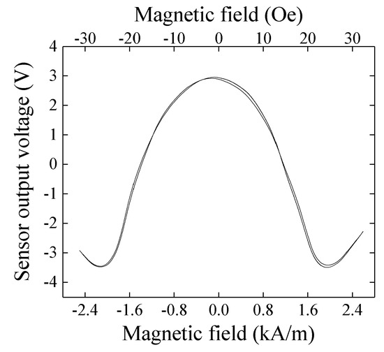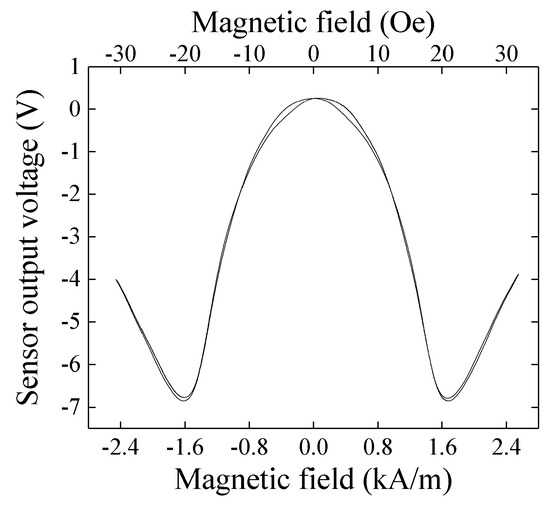 In this measurement, the normal magnetic field was in a room condition of Japanese north-east region. The output voltage was ranging from −7 V to +0.2 V and it was in good agreement with the impedance profile of the sensor element. In our measurement the baseline level was an arbitrary one because a level of offset compensation in the final circuit stage was arbitrary. The profile of sensor output (Figure 7) was a vertical inversion of the element impedance (Figure 2). The reason is that the RF level come out from sensor element is inversely proportional to its impedance.