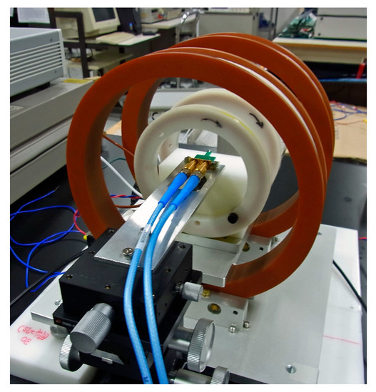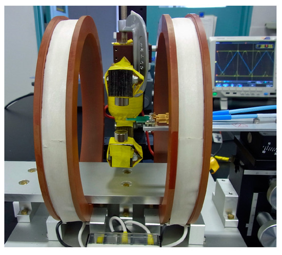 Figure 8 shows measured results when a normal magnetic field, Bz = 1,100 G (0.11 T), was applied to the sensor element. In this measurement, the external magnetic field was applied in X direction. As the normal field increases, the vertical range of variation slightly decreases even it is keeping a low hysteresis of impedance variation. It means the sensitivity dV/dH does not decrease even in 0.11 T normal field, where V is the output voltage and H is the magnetic field. Here the normal field was applied by NdFeB magnets placed both on the upper side and on the lower side of the sensor element. These magnets were attached on an opening tip of a C-shaped magnetic core made by a bundle of silicone-steel sheets. The external field in the sensing direction was applied by a Helmholtz coil. A photograph of the measurement apparatus is shown in Figure 9. This result shows that the thin-film magneto-impedance sensor has a possibility to be useable even in hundreds of mT normal magnetic field and a strong candidate for detecting foreign inclusion in the manufacturing process.