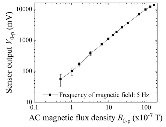 Figure 12 shows a variation of the sensor output as a function of AC magnetic flux density at 5 Hz applied to the sensor element. This log-log plot shows that it has approximately linear relation. Due to a limit of output level of the final-stage amplifier, up to +14 V, the maximum value of output was +14 V in this study. The system developing in this study is designed for use in manufacturing process without magnetic shielding. Due to it a circumferential magnetic noise would be approximately several mG. With consideration of a background noise of the driving circuit, the minimum signal level must be larger than 0.1 mV in amplitude level. The output level of the developed driving circuit conforms to this design criterion. The AC field ranging from 1 × 10−7 T to 160 × 10−7 T corresponds to the output level ranging from 0.1 V to 14 V.