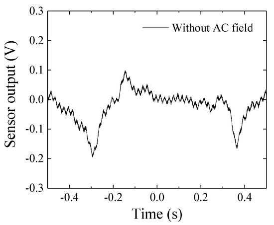 Figure 17 shows a measured signal when a 5.1 × 10−8 T0-P in 5 Hz was applied to the sensor element. We can see the periodical sine signal in this measurement. It is natural that this sine-signal is combined with the system-noise (Figure 16), but the 0.2 s periodical peak is clearly observed.