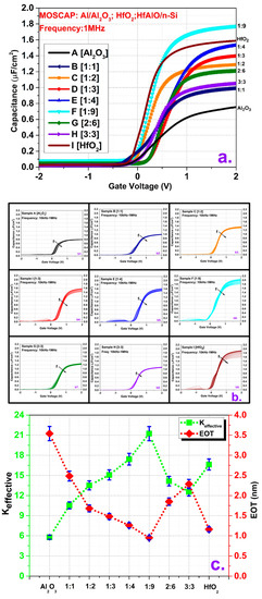 (a) Capacitance–voltage (C–V) behavior of the HfAlO MOS capacitors with single Al2O3 and HfO2 ones at 1 MHz frequency. (b) Multifrequency (10 kHz–1 MHz) capacitance–voltage (C–V) response of all deposition cases. (c) Extracted dielectric constant (k) and equivalent-oxide-thickness (EOT) values for all reported splits.