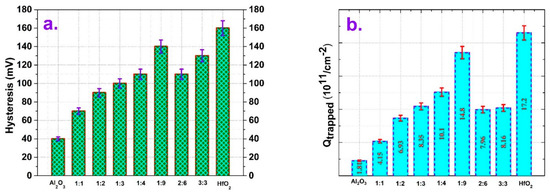 where Qtrapped denotes the trapped charge density per cm2, Cox represents the oxide capacitance in F/cm2, ΔV is the voltage shift as measured at V, and q is the elementary electron charge in C. This surface charge includes the charges located near or at the dielectric/semiconductor interface, which are differentiated as fixed charge, ionized traps, and mobile ions. These fixed charges cause a C–V curve shift along the voltage axis in the parallel direction, and the two-dimensional distribution of these traps contributes to the overall capacitance. Since the high frequency hysteresis measurement excludes the small signal voltage information, it is represented in cm−2 rather than cm−2 eV−1. However, it is clear from the figure that the trapped charge density follows almost the same pattern as Figure 2a, since it is proportional to the hysteresis width even though it is affected by different Cox values. The single Al2O3 layer showed the smallest number of traps (1.81 × 1011/cm2), and HfO2 had the highest (1.72 × 1012/cm2), while HfAlO samples were within these two boundary points. Sample B (Al: Hf = 1:1) alloy showed the lowest trap density among the HfAlO alloys, while sample F (Al: Hf = 1:9) showed the largest. Sample H (3:3) also showed a higher value, as previously mentioned.
