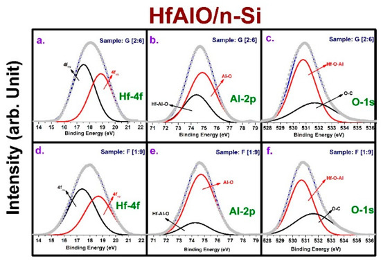 Hf-4f, Al-2p, and O-1s XPS core level spectra: (a–c) sample G (Al: Hf = 2:6) and (d–f) sample E (Al: Hf = 1:9).