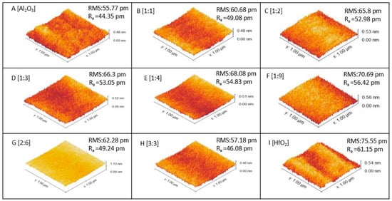 Figure 4 illustrates the 3D AFM images for surface morphology analysis in tapping mode on the HfAlO samples, with a scan area of 1 μm × 1 μm and a resolution of 256 points × 256 lines. For better understanding, both Al2O3 and HfO2 films were also analyzed. The root-mean-square (RMS) and the average roughness (Ra) of the surface in the figures indicate the roughness measurement of the films. It is observed that the surface of the Al2O3 is quite flat and uniform compared to the HfO2 surface. The RMS value for Al2O3 is 55.77 pm while for HfO2, it is 75.55 pm. The HfO2 films with Al incorporated show a smoother surface than the HfO2 film without Al. Among the HfAlO films, sample H (3:3) has the lowest RMS roughness (57.18 pm) while sample F (1:9) has the highest (70.69 pm). The average roughness (Ra) follows the same trend as RMS roughness. The decrease of surface roughness in the HfAlO film compared to the HfO2 film indicates a structural change.