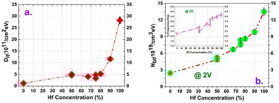 Here, A is the electrode area, while q is the elemental electron charge. From Figure 5a, it is evident that Al incorporation helps to passivate the dangling bonds as the HfAlO films showed fewer defects than the pure HfO2 film. Also, the increased Al amount in the HfAlO film provides a better interface as the single Al2O3 showed the lowest Dit value. Moreover, characterization of border traps (Nbt) mainly highlights the accumulation frequency dispersion rather than hysteresis width. It has been reported that border traps are only probed by accumulation frequency dispersion around a solitary energy level at the maximum accumulation bias voltage based on the assumption of spatial distribution of traps inside the oxide; in contrast, border traps with energy levels below the fermi energy at the maximum bias voltage are filled during C–V hysteresis measurements, and these traps are at such distances that they do not re-emit the captured charges during the reverse sweep hysteresis analysis [25]. The frequency dispersions shown in the inset of Figure 5b are calculated according to the following equation: