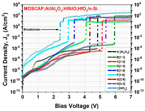 Figure 6 shows the leakage current densities and breakdown voltage characteristics of HfAlO alloy films with Al2O3 and HfO2 films after applying a positive bias voltage. The HfO2 film showed a two-order-higher leakage current and the lowest breakdown voltage of 4.8 MV/cm (located around 2.43 V). Single Al2O3 showed a leakage current in the 10−11 A/cm2 range and a breakdown voltage around 8.2 MV/cm. It is evident that Al incorporation into HfO2 reduced the leakage current and increased the breakdown voltage by providing a defect-free dielectric (as discussed earlier), greater dangling bond passivation, and increased band gap. Here, sample B [1,1] and sample H [3:3] showed higher breakdown voltages as they have higher thicknesses and greater Al content based on deposition cycle design.