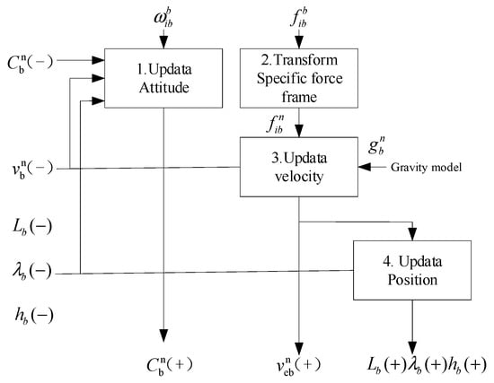 The process of strap-down inertial navigation attitude, velocity, and position update is presented in Figure 3: