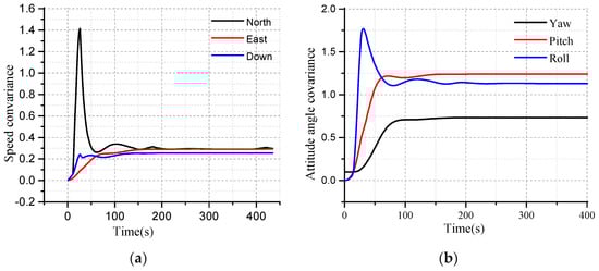 The test site is the road around the laboratory and the vehicle is as shown in Figure 11b. The point from the start of the vehicle to the end of the trip is a closed loop. Three experiments were analyzed as a group. The attitude angle error at different velocities was tested, as well as the heading angle accuracy of the straight lines and curves. The time and convergence accuracy of the EKF was at test. The initial vehicle is in the stationary, and the initial alignment is performed. The heading angle converged by the EKF gradually, and the heading angle and the pitch angle are provided by the GNSS as the initial attitude angle.