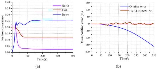 In the project, in addition to considering the type of sensor applied, the environmental conditions of the system application, the complexity of the algorithm, the accuracy, and the cost of hardware equipment should also be considered. The EKF is a good combination filter. Based on the above considerations, we propose a combination of dual-antenna GNSS and a Micro-electromechanical Systems-Inertial Navigation System (MINS). The dual-antenna GNSS can provide accurate velocity, position, heading angle, and pitch angle []. A gyroscope can provide a high precision attitude angle in a short time but suffers from accumulating errors caused by the gyro biases. Two-antenna GNSS can provide a very accurate yaw angle and pitch in a long time, but the update rate is low. Thus, it is reasonable for it to be combined with the high update rate derived from gyros. In this way, system navigation performance could improve. EKF is a very practical nonlinear filtering algorithm. Because of its simple structure, it is widely used in the field of integrated navigation []. Considering the accuracy and real-time of the algorithm, EKF is used as the combined navigation filtering algorithm. Therefore, the integration of these sensors and filtering algorithms seems to be optimal.