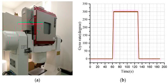 Based on the characteristics of the IMU error model of the MEMS gyro affected by temperature changes requires temperature compensation. Using a two-axis turntable with internal temperature control as the calibration device, as shown in Figure 9a. The standard input speed is set to 300°/s for the control turntable. The output speed of the gyroscope after the calibration is shown in the Figure 9b.